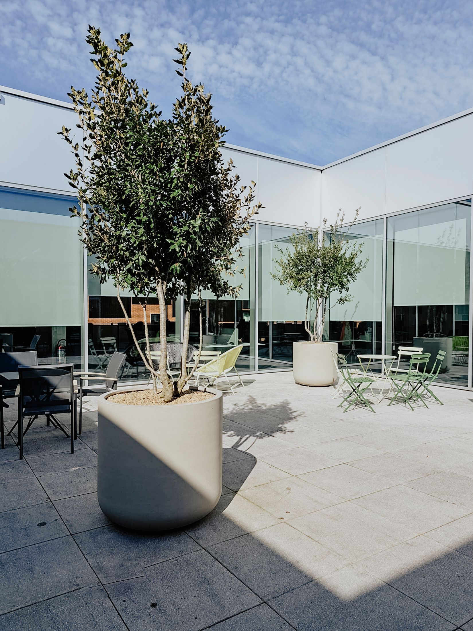 We zetten in op het creëeren van projecten die uw werknemers en ook uw klanten positieve energie geeft: inkomgedeelte, een (dak)terras, een binnentuin, een groene zone rondom het kantoor of aan het parkinggedeelte.